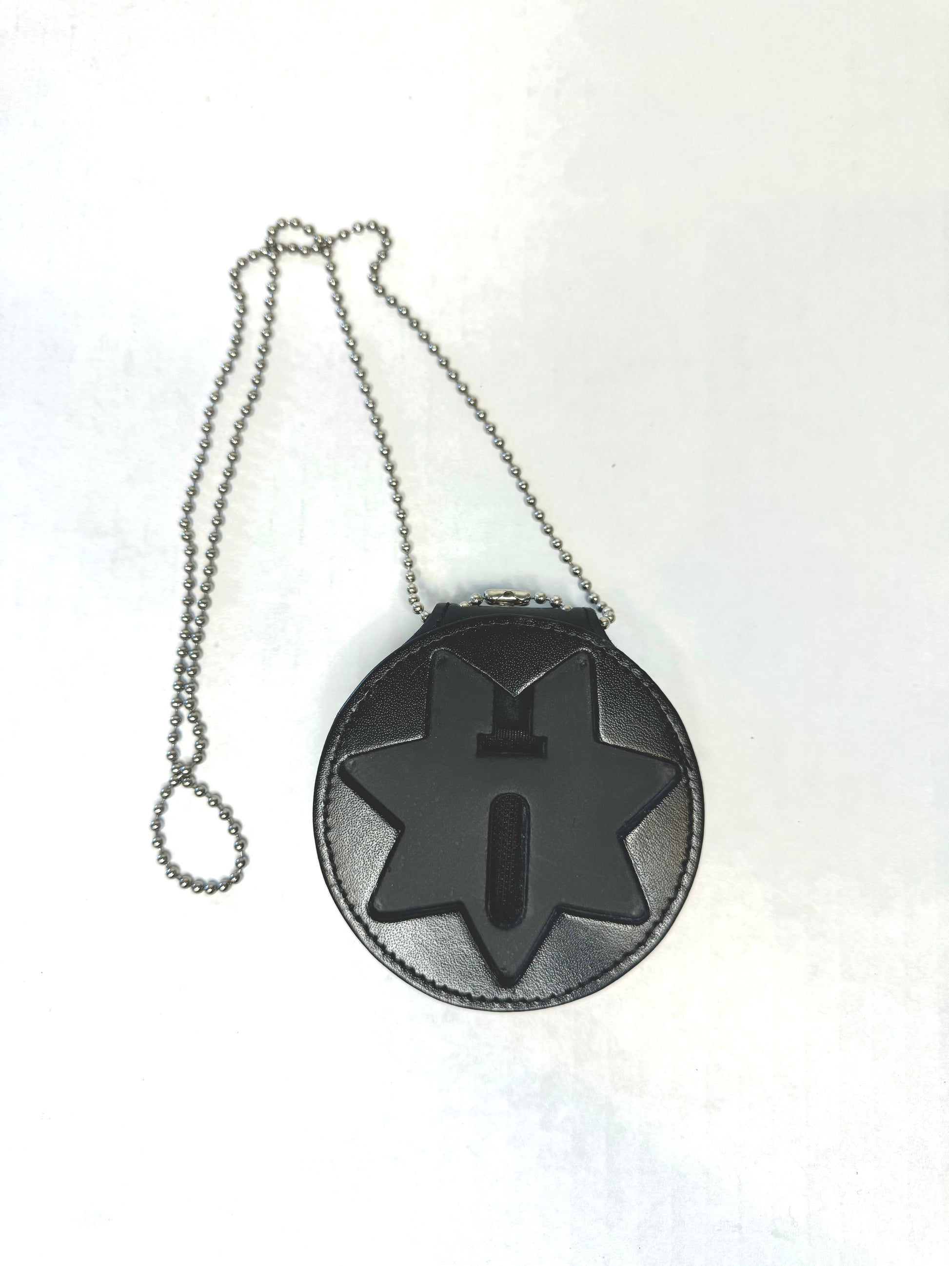 The Model 7350-01 Badge Holder clips on the belt for easy access and high visibility. It is constructed of a sturdy leather look synthetic with a heavy duty metal clip to provide secure attachment. The clip accepts belts up to 1.75" wide. This round badge holder is 3 " (76 mm) in diameter, designed to carry a star badge.