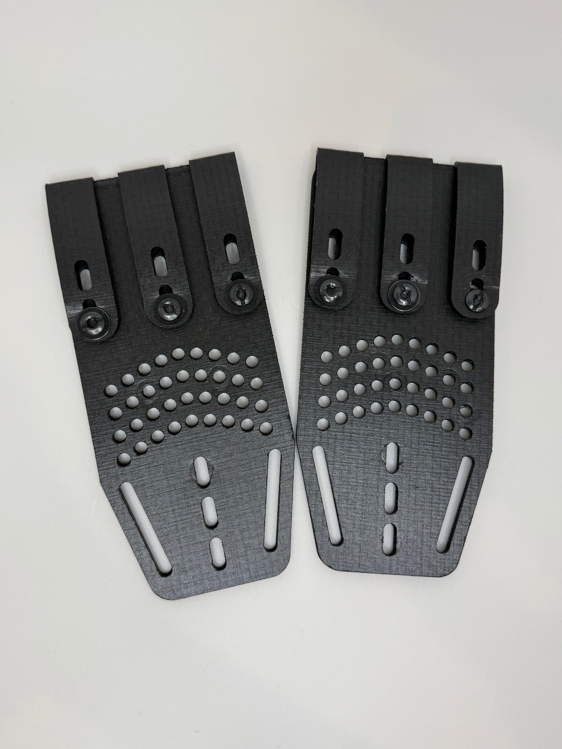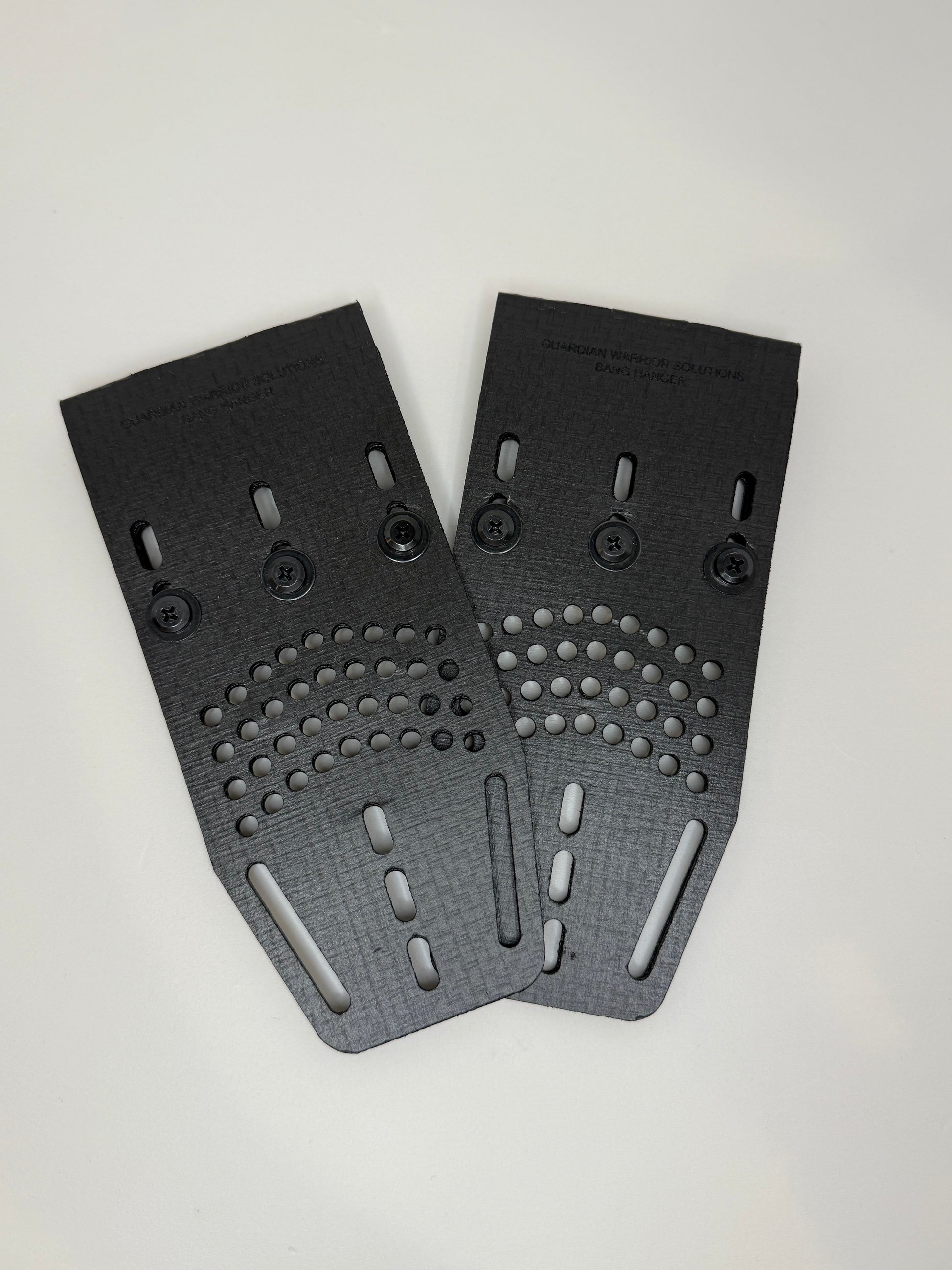 The Bang Hanger is a 12 -layer Tegris mounting plate for weapon systems to attach to a belt.