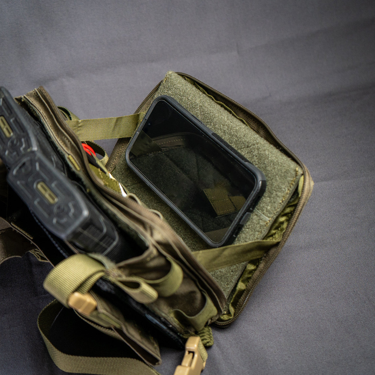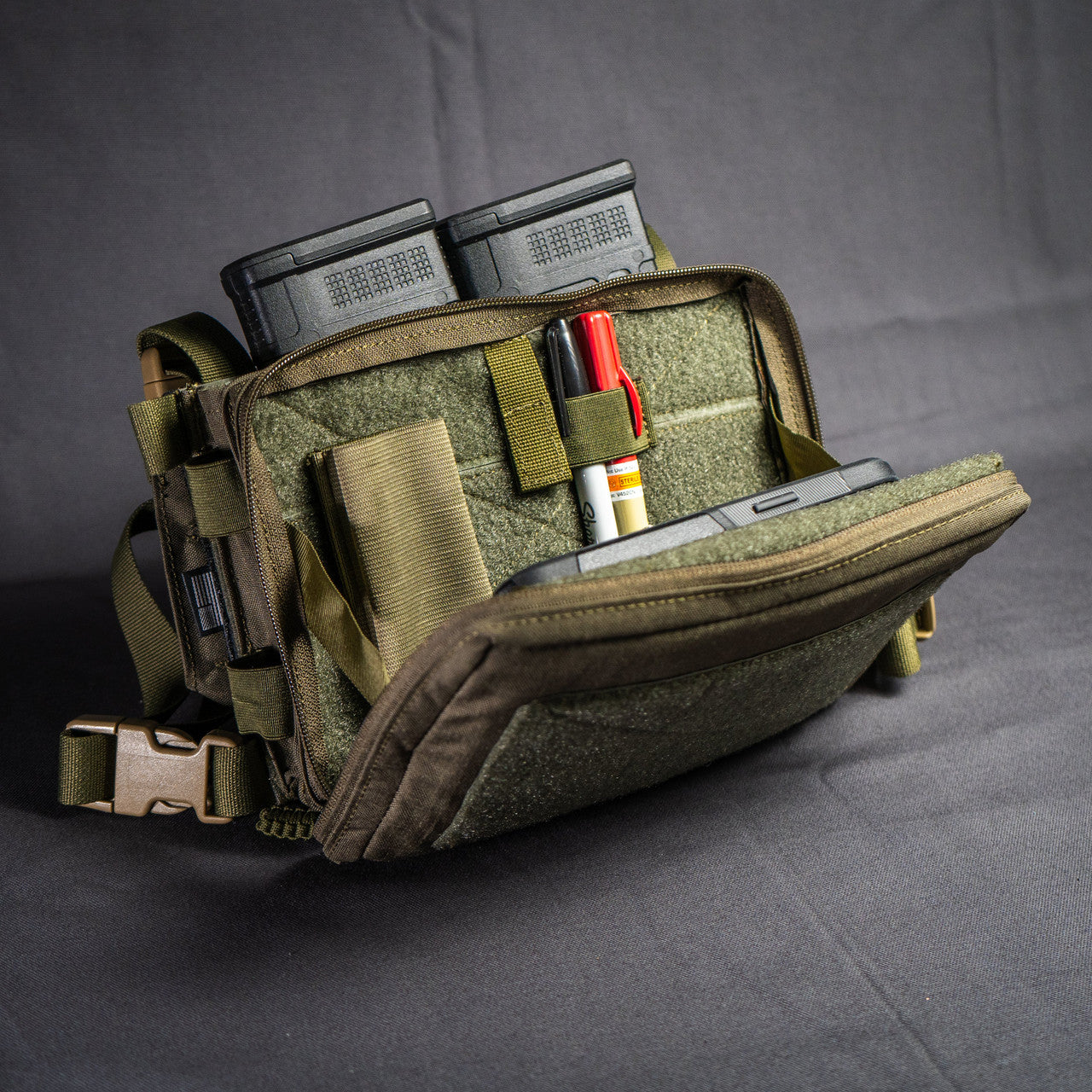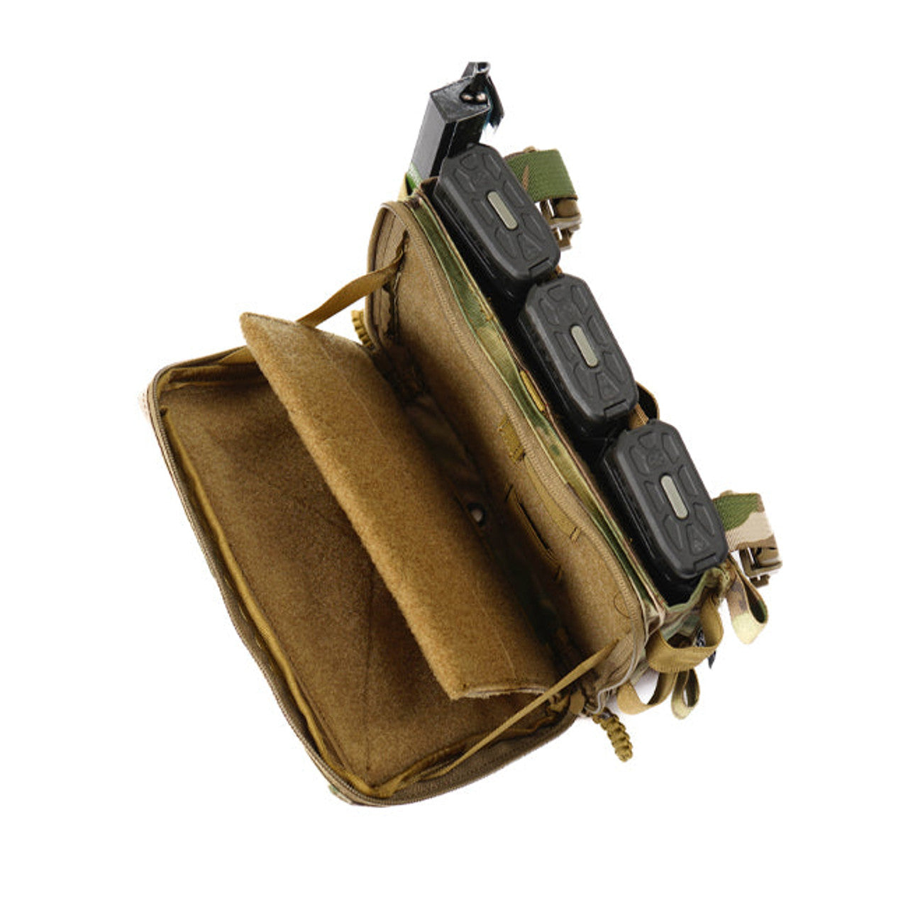This Placard holds three .223/.556 mags in soft elastic mag holders, has two open admin pouches on the inside with 2 open and 2 closed bottom elastic sleeves, a thick internal tab that has a pocket for storing maps, phones, trauma sheers, or any other small kit, and elastic bands on the sides for small kit including tourniquets. We added a thick plastic core to the tab in this pouch. This will protect your navigation equipment from rocks or sharp objects when laying prone.