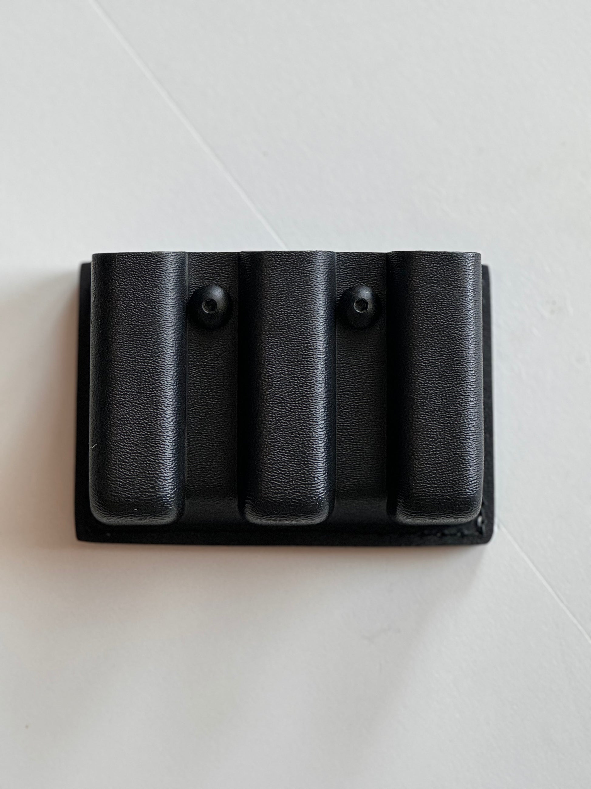 The Model 775 Triple Magazine Pouch is designed to carry three magazines on a 2.25" (58mm) duty belt. The 775 features vertical belt slots. A magazine tension screw located between the two pouches allows for easy retention adjustment. It's constructed of rugged SafariLaminate™.