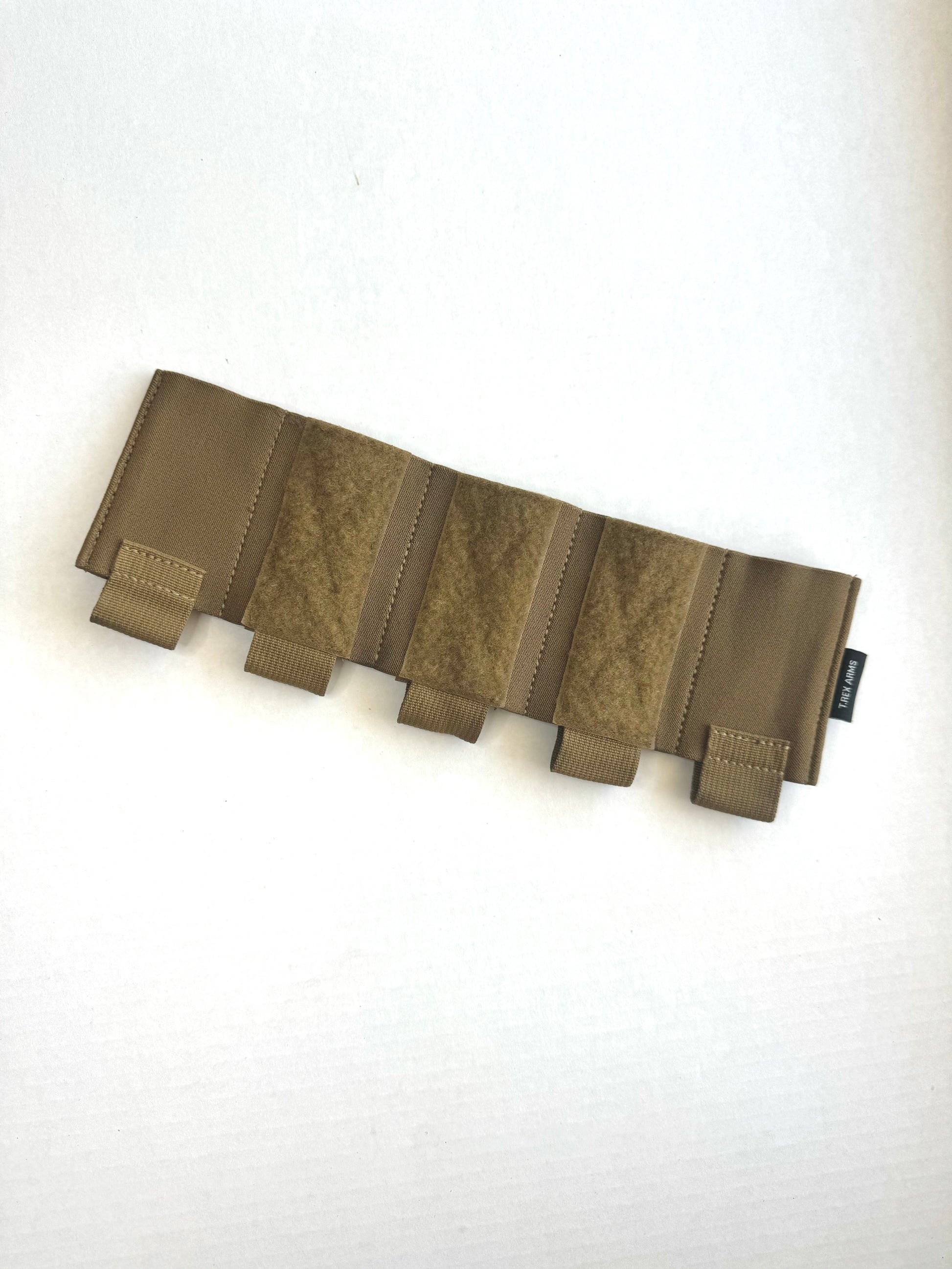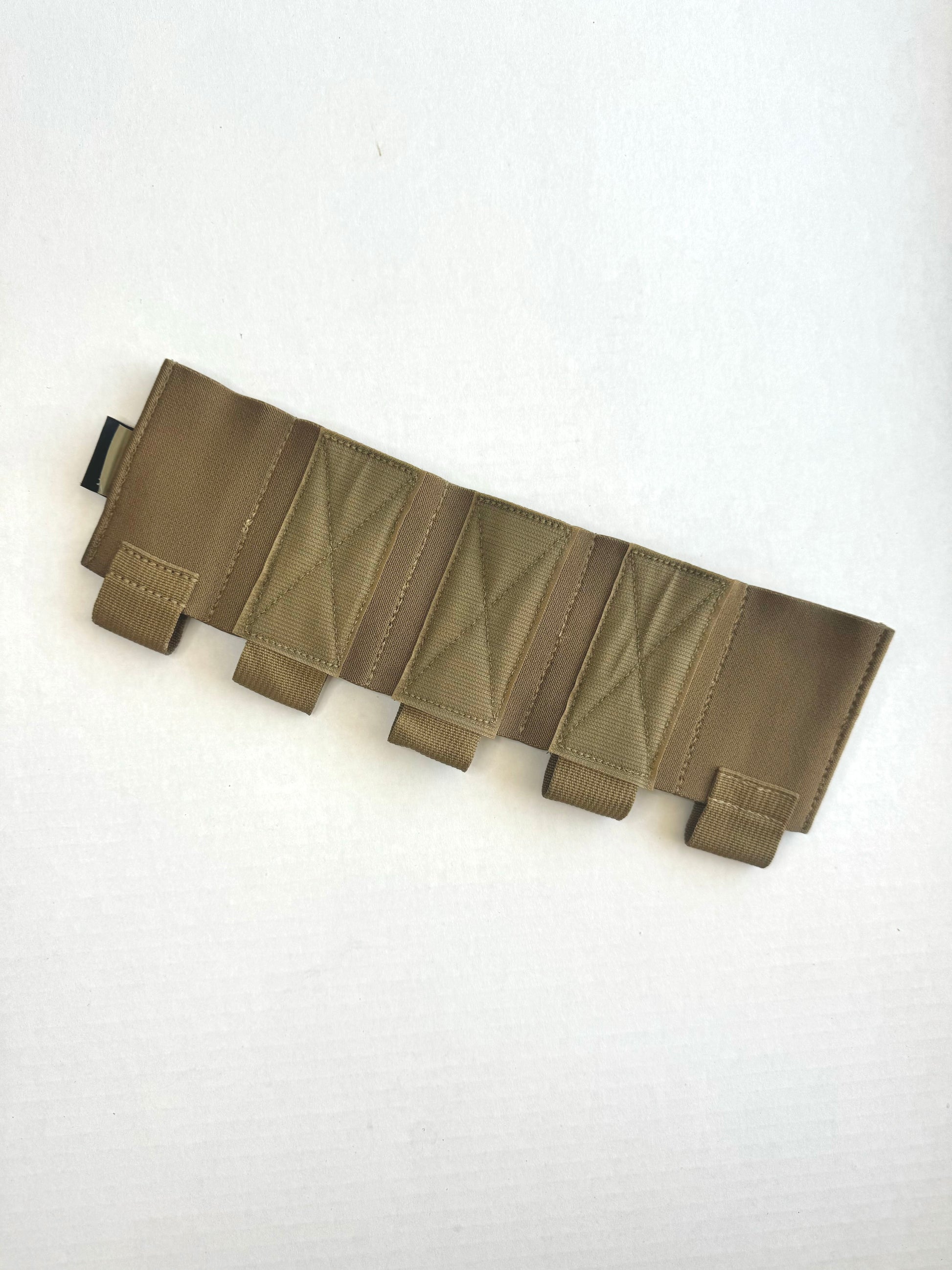 This is our go-to mag carrier for slick and compact plate carrier setups. It consists of five elastic cells with a velcro hook field on the back and a velcro loop field on the front. This allows it to slap on and stick to the front of any plate carrier on the market that has velcro loop on the front. Then the cummerbund of a plate carrier can wrap around and stick to the front of the shingle, pulling it and its contents in super tight.